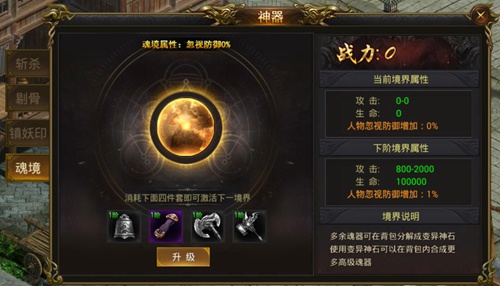 神器系统包含四大内容,分别为斩杀、剔骨、镇妖印、魂境。