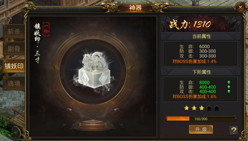 击杀BOSS即可获得镇妖值,BOSS等级越高,获得镇妖值越多。满足镇妖值后,即可升级提升属性。