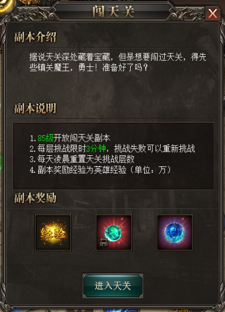天关共30层,每通关一层,即可获得大量英雄经验、灵魂碎片和真气丹,提升英雄等级、英雄灵魂刻印等级和经脉等级。