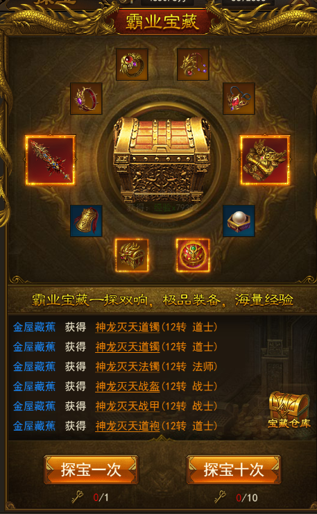 通过探宝有几率获得霸业神剑神甲、各职业极品装备、大量材料等珍稀道具。欧皇附体,一步登天不是梦哦!