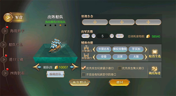 第一天只要把开放的活动都做完,主线港口开启到打不过的程度,基本就能三十多级,如果有充值呢还会有额外的经验,等级会更高。大部分系统都开放啦,简单说几个,主舰培养一件升级就好,记得隔一段时间来瞅瞅是否能进行下一轮,军营系统在参加3次大海战后就可以开放了,只用挂机就可以一直自动进攻了,获得不错资源,记得勾选优先攻击玩家最少的港口,这样效率才是最高的。