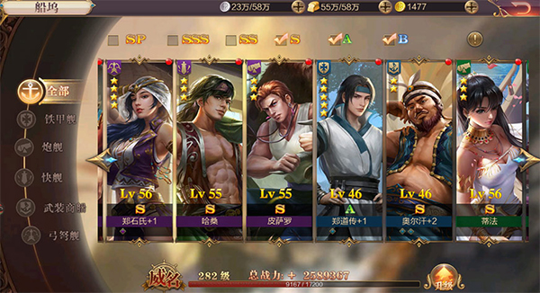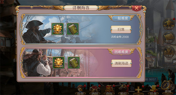 和大部分SLG游戏一样,前两天都是需要比较多的时间来进行开荒,这些都跟着开放等级走即可,各种副本产出,升级奖励,海面上也有很多的资源可以捡。在开荒过程中积累资源会比较多,尤其是银币、食物、经验书,建议先只升级需要上阵的5个船长即可。银币在各种升级系统都要用到,虽然前期资源丰富,但消耗也非常快,千万不要浪费;而粮食除了战斗消耗外,船长训练进阶需要的材料主要通过剿匪获得,剿匪就需要消耗大量的粮食,尤其是在船长达到紫色品质后,食物就成为非常紧俏的资源了。