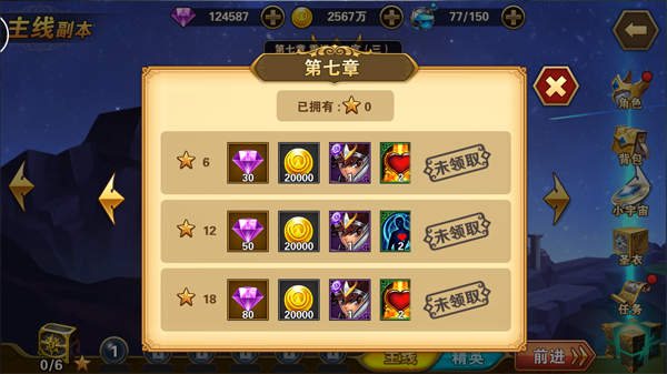 通关主线副本和精英副本后根据副本通关情况会获得不同的星级评价,每章节星级达到对应值后可以点击章节宝箱领取。不要小看这点钻石哦,前期累积下来也是一笔不小的财富哦。