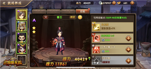 通过升级技能,可以使必杀技威力和人物属性加倍提升,除队长技外,所有武将的主动、被动技能皆可升级,而所消耗的升级点数将会自动补充,非常实惠加贴心!武将升星后会解锁全新技能,使战斗力再次飞升!