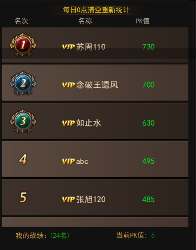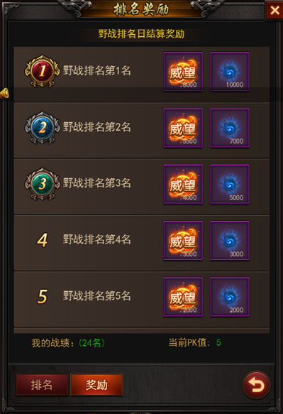 PK值将直接影响野战排行榜,每日将根据排名情况给与玩家相应奖励,除此之外野战榜前10名的玩家还可获得专属极品称号。