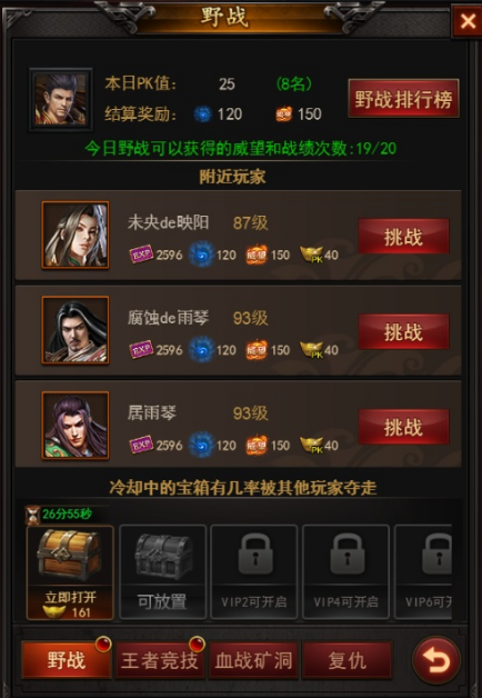 野战玩法是前期最直接的PVP玩法,杀人越货,击败对方后,可抢夺对方的PK宝箱据为己有。VIP玩家还将永久免费开启pk宝箱槽个数,野战玩法最多可刷新6位野战玩家,每挑战1名后,都会有时间倒计时,倒计时结束后,再次刷新出新一轮玩家,每天前20次野战还可获得大量威望和战绩。