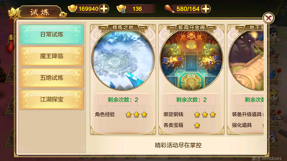在日常试炼玩法中,玩家可以挑战多种试炼副本,每种副本都有着自己独特的奖励,如修炼之地可以为玩家提供大量经验;秘宝矿洞中玩家可以获得大量宝石素材及生产材料;守卫摩云顶则可以产出大量的武功及气功道具。不同试炼的开启时间有所不同。参加试炼需要消耗一定的体力,在体力有限的情况下,要优先选择自己最需要的试炼参加哦1