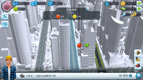 然后随着城市的发展,房屋越建越高大,城市人口越来越多,同时城市的车辆也是越来越多,这时道路就会出现拥堵了,就需要玩家升级道路以提升它的承载能力。
