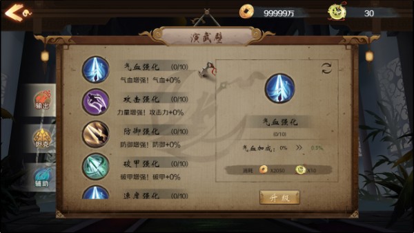 1.玩家可通过演武壁技能升级,提升豪侠、影卫及隐士的能力。