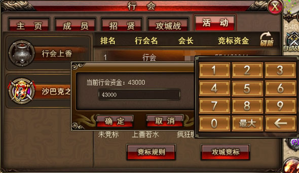 那么怎么竞标呢?在本次测试中,将会在12月7号9点钟开始开放沙巴克攻城战的竞标。此时玩家会长即可在行会界面中参与沙巴克攻城战的竞标。12月9号晚9点,沙巴克攻城战竞标结束。此时排行前四名的沙巴克行会取得沙巴克攻城战的资格。