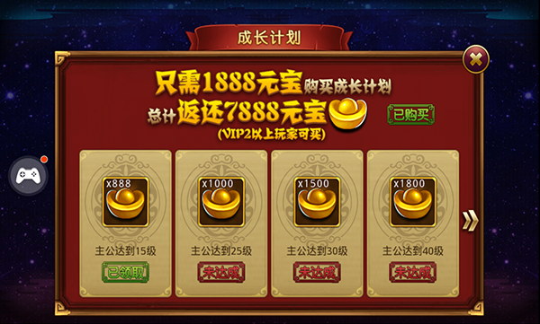 点评:V2的特权成长计划,这个也是很常见的福利了。消费1888元宝,随着主公升级将分段总共返还7888元宝。有的主公可能要问了:1888元宝也不是个小数,充值V2怎么够呢?对于这个问题请看攻略:新手如何快速获得元宝《新塔防三国-全民塔防》