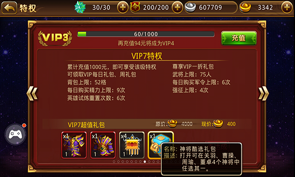 点评:V7没有新开放的特权,但是在一折礼包中,却有着令人垂涎三尺的神将酷选礼包,可以在关羽、曹操、周瑜、董卓4个神将中任选其一!每一位都是响当当的三国英雄,名至实归。如果有付费动力,那么充到V7开局一定不亏,但像小编就只能在解解眼馋的同时,去神将活动中拼扶老奶奶过马路了……