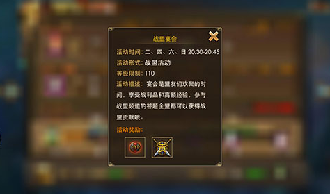 玩家等级达到110级,就会解锁战盟宴会任务。该活动每周二、四、六、日20:30-20:45定时开启。