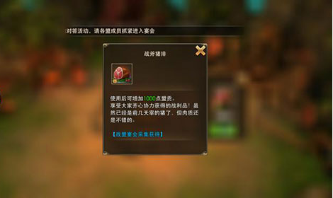 进入领地后,大家记得点击烤架上的烤猪,使用后增加1000点盟贡。