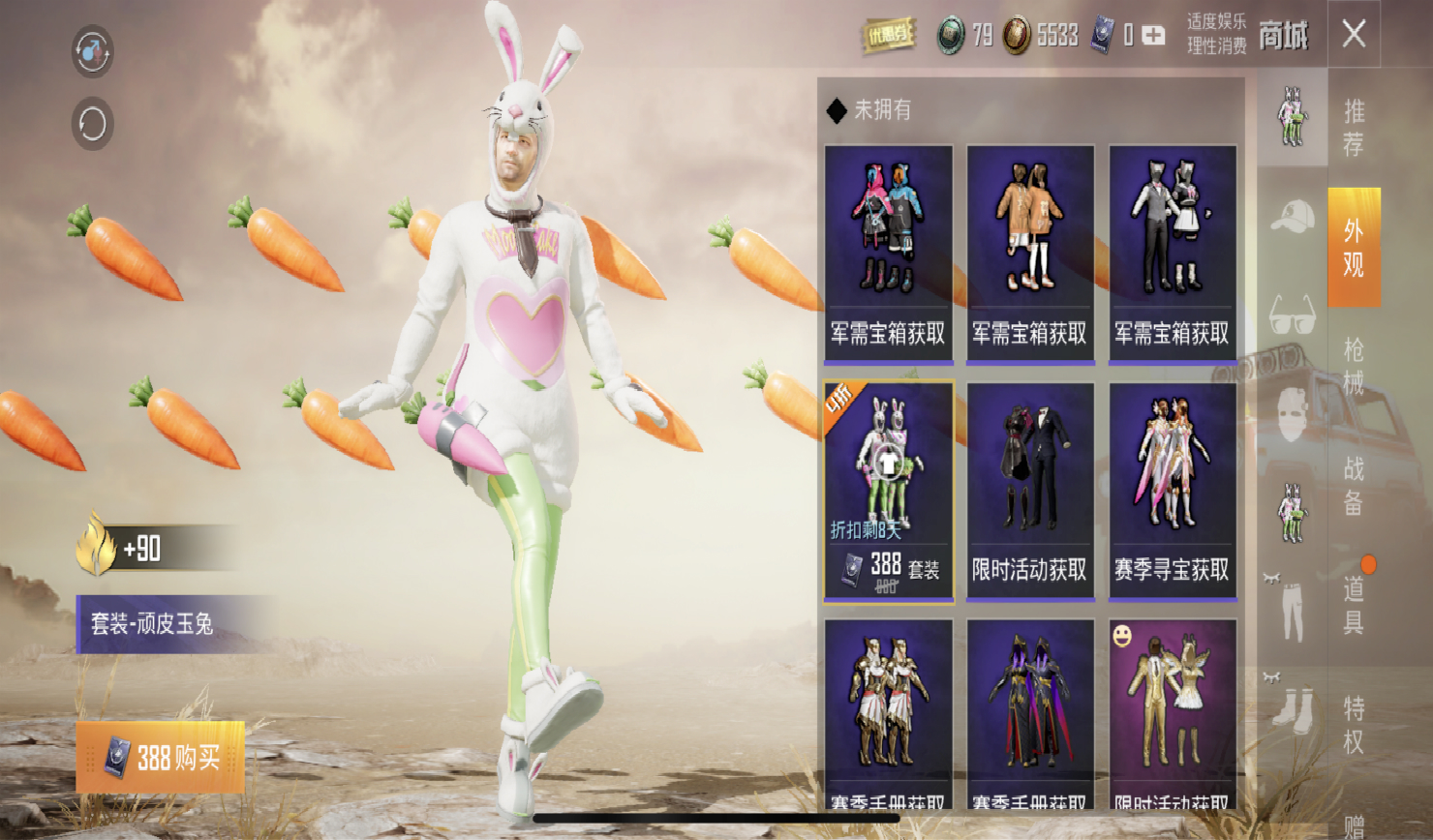 此次《和平精英》迎来双节之际,不仅带来了1套“神秘黑猫”,而且还出现了可以用点券直接兑换的“顽皮玉兔”。如图所示,目前这套衣服仅需要388个点券就能直接兑换了,不过由于造型相当的“别致”(天哥实在不知道怎么形容这套衣服了),所以兑换的玩家并不多 。