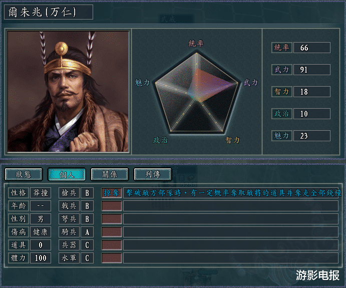 掠夺:击破敌方部队时,有一定概率夺取敌将的道具并夺走全部钱粮。