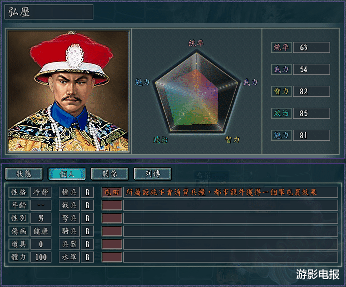 详解:所属设施(这里的设施指代的是都市、港口和关隘等能够驻军的地方)不会消耗兵粮,也就是原版《三国志11》对于屯田的加强版,因为原版的设定只针对港口和关隘不会消耗粮食,现在对于都市也有了这样的效果;都市额外获得一个军屯农效果,是《血色衣冠》中对于原版屯田过于强大的设定进行的适当削弱效果。也就是说《真英雄》当中的屯田不仅增加粮食产量,还可以让都市中的士兵和马匹不消耗粮食。