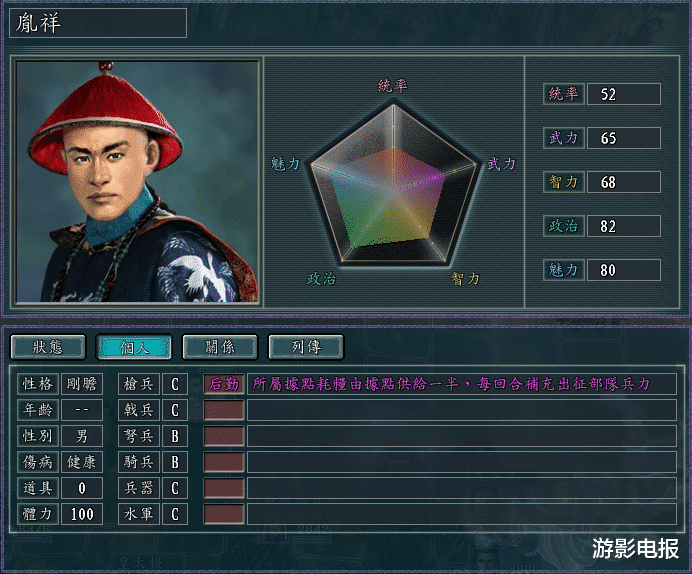 详解:每回合为在阵、砦、城塞范围中的本方部队提供 10% 的兵力,同时对于本方部队还有着降低消耗本队携带粮食的一半效果。