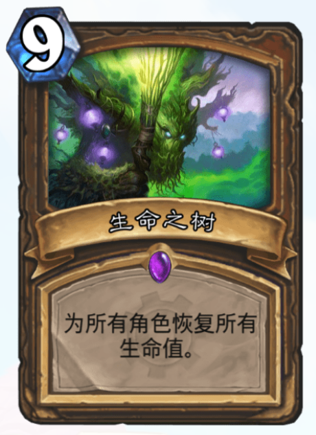 其中最典型的就是德鲁伊的生命之树(九费为所有角色恢复所有生命值),加牧师的暗影之握(两费,在本回合中你的治疗效果转为等额伤害)。两张一起就是世界名画天地同寿,虽然这操作未必能让你获得比赛的胜利,但是视觉效果绝对没问题。