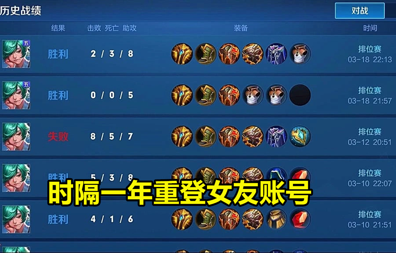 分手之后,小伙子卸载了游戏,因为看到游戏就会想到女孩,想到在一起时的甜蜜。时隔一年之后,小伙子还是没办法忘记女孩子。于是就重新下载了游戏。在游戏登录界面里面,还存着前女友的账号,小伙子鬼使神差地登了上去。他看到女孩子的战绩,还停留在他们吵架的那一天,看来女孩子和他一样,分手之后再也没有玩过游戏。