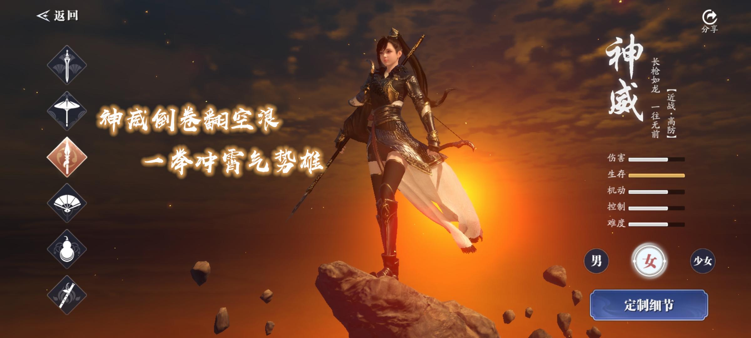 神威轻功狂拽炫酷,大轻功一蹦三尺高,只要操作得当,就像“窜天猴”一样“嗖”的一下不见影踪,所以当年在端游里大家都给神威叫窜天猴。但是现在各大门派谁还没个大轻功啊,所以估计以后也没有人会再给神威叫“窜天猴”了。神威的优点在于下本时可以团队减伤,PVP模式时霸体时间长,连招多,输出稳定。神威最大的缺点应该就是手短伤害低了,但是神威本身就是一个团队型的职业,所以这些缺点可以被队友轻松弥补。