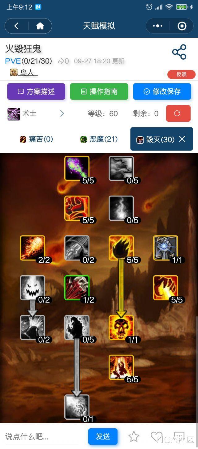 目前主流的牺牲火毁为9/21/21,有瞬发腐蚀以及强化分流。本次推荐天赋完全放弃腐蚀及诅咒等暗影伤害能力。以献祭,灼热之痛,地狱烈焰为主要伤害获取来源,加上小鬼的不定时爆发。