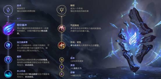 和发条类似,辛德拉在比赛中也多以相位猛冲主系符文出现,技能连招可让其快速触发爆发性移速,在团战中可以更好的进行发挥,法力流系带缓解对线期间的蓝量消耗,超然可获得技能冷却缩减,水上行走来快速进行游走支援队友。