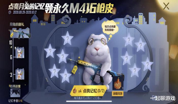 每一次点亮记忆,都需要消耗4个胡萝卜月饼,点亮记忆的同时会获得随机掉落的奖励并且增加1点进度,达到一定进度之后可以领取到“奇萌兔兔宝箱”,点亮进度达到10的时候,可以直接领取到M416夜灯永久免费皮肤。
