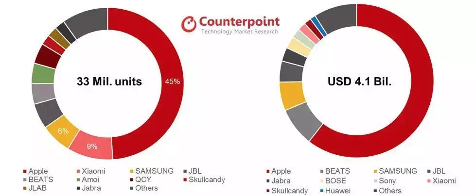 当初确实很多人不看到,但直到现在,AirPods 已经占领了无线耳机市场一大半的份额。